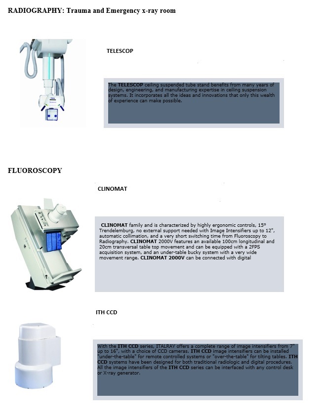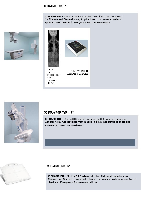 X FRAME DR – T: is a DR System, with single flat panel detector, for Trauma and General X-ray Applications: from muscle-skeletal apparatus to chest and Emergency Room examinations.